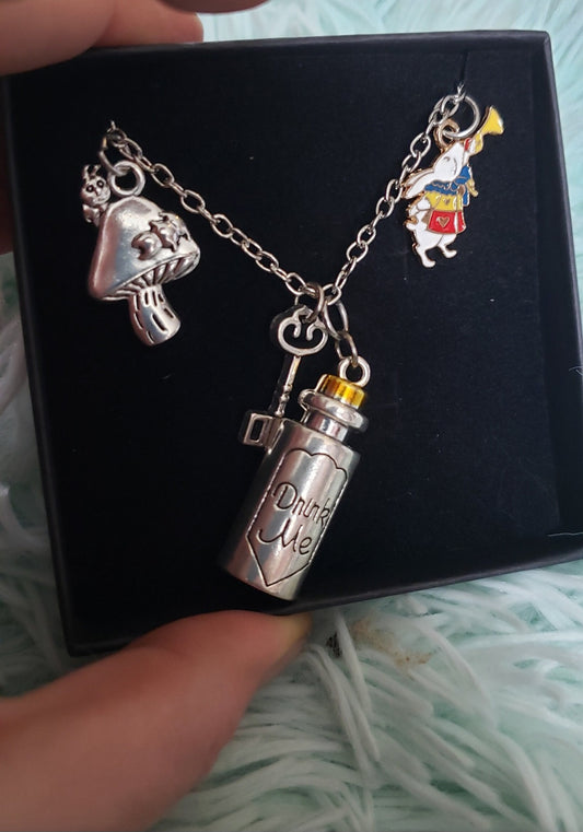 Handmade "Alice In Wonderland" CHESHIRE CAT |White Rabbit| Alice Colored Enamel Charm Necklace w Rose Quartz Chain- Ui'Cathain Designer Charm Collection