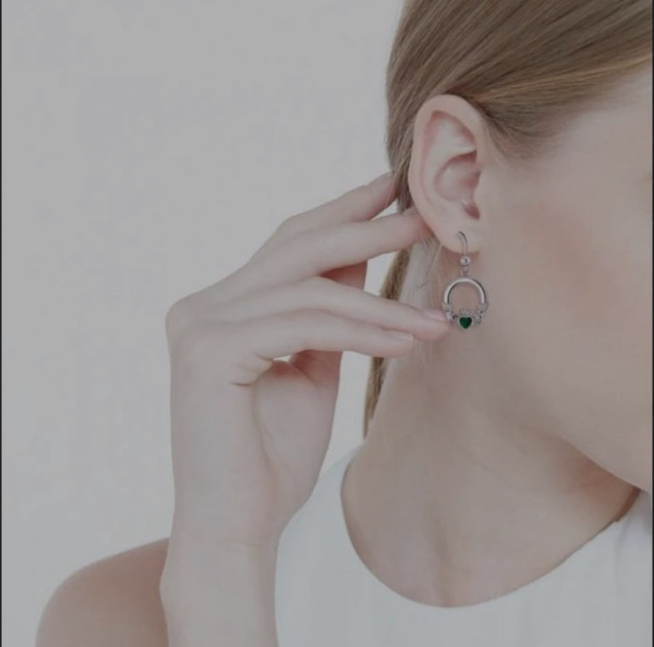Discover the charm of Irish tradition with our Sterling Silver Claddagh Dangle Earrings with Malachite! Adorned with a timeless Claddagh design, these earrings symbolize love, loyalty, and friendship: the heart for love, the hands for friendship, and the crown for loyalty.